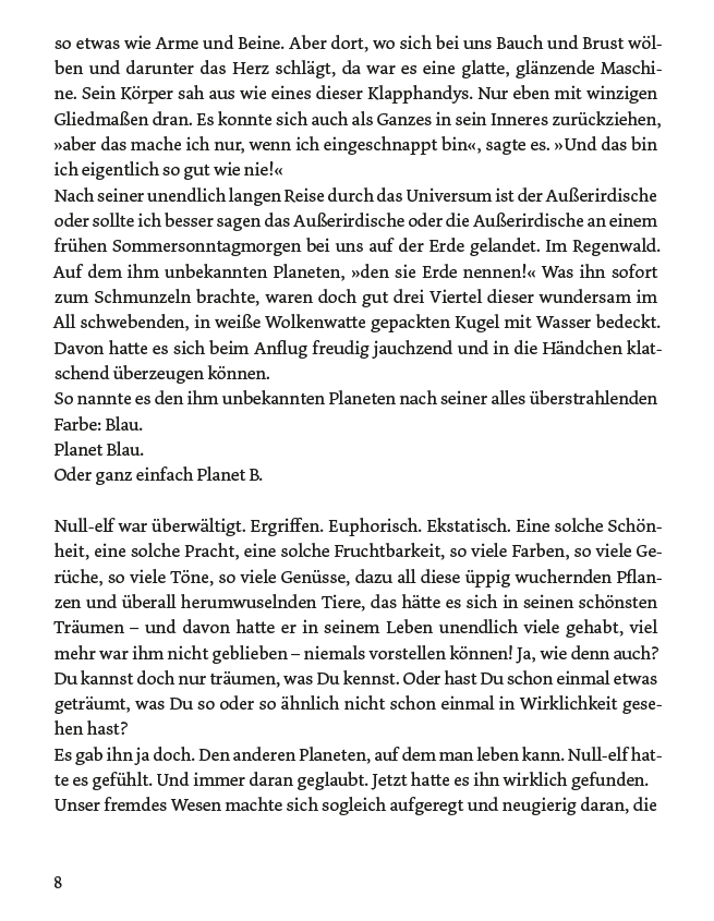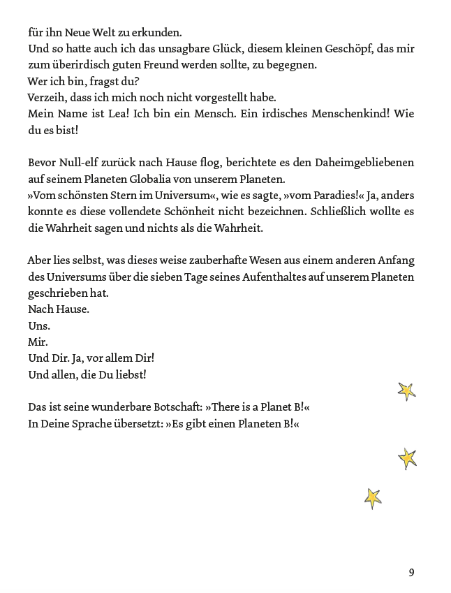 Als „011“ zurück auf seinen zerstörten Planeten Globalia muss, verspricht ihm Lea, gut auf das Paradies aufzupassen, bis er wiederkommt. „Es gibt nur dieses eine!“ Ein Versprechen, das wir alle geben sollten – als Kinder dieser Erde.